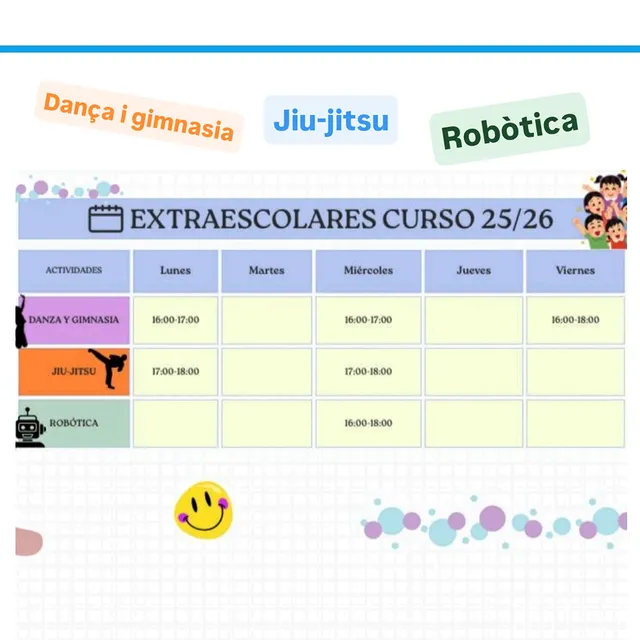 Extraescolares AFA CEIP Sant Jordi, Extraescolares 2025/26 AFA CEIP Sant Jordi, Extraescolares 2025/26 Ya están publicadas las extraescolares que ofrece la AFA del CEIP Sant JordiEste año tenemos Danza y Gimnasia, Jiu-Jitsu y Robótica. Inscripciones en el siguiente botón Inscribirse aquí Inscribirse aquí