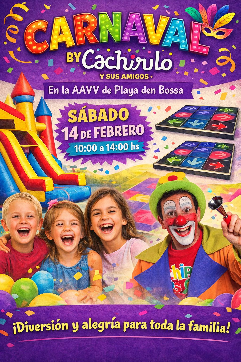 El próximo Sábado 14 de Febrero en la AAVV de Platja den Bossa celebra el carnaval con Cachirulo y sus amigos de 10 a 14h.