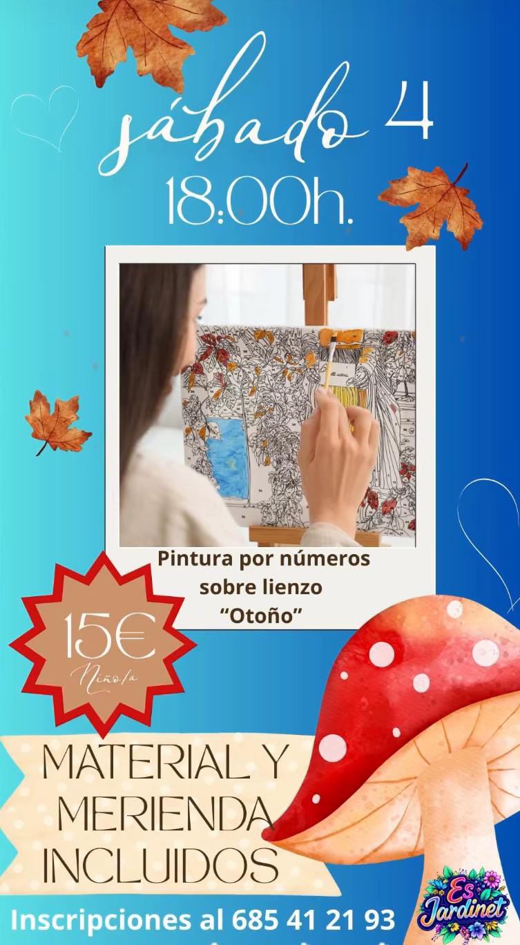 El sábado 4 de Octubre de 2025 a las 18:00 en es Jardinet Taller de pintura por números sobre lienzo