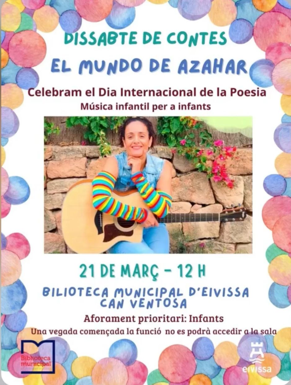 El próximo 21 de Marzo a las 12h se llevará a cabo el «Dissabte de contes» con El Mundo de Azahar celebrando el día internacional de la Poesía con música infantil para niños y niñas.