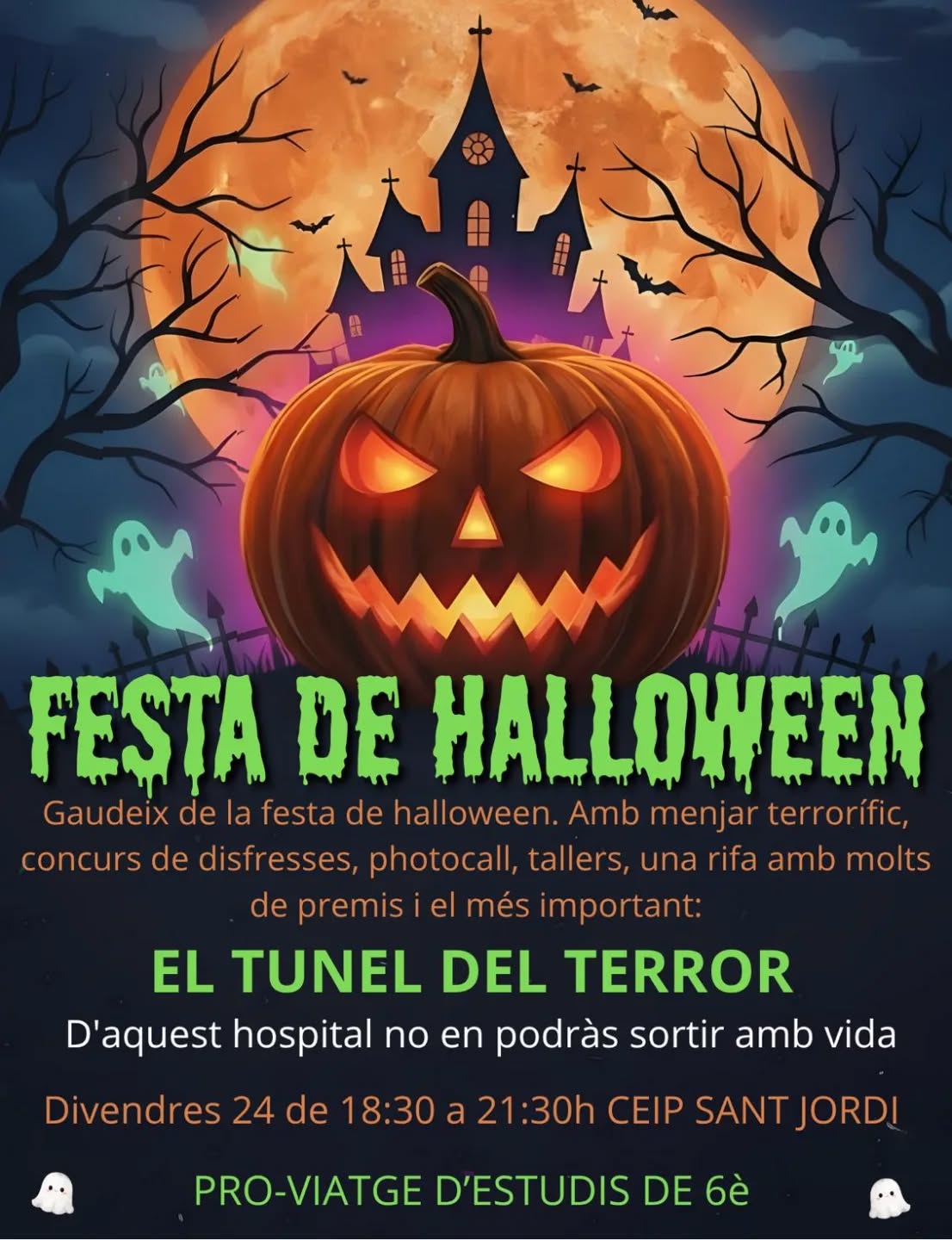 El próximo Viernes 24 a partir de las 18:30h el en CEIP Sant Jordi podréis disfrutar de una fiesta de Halloween en beneficio al viaje de estudio de los niños y niñas de 6º curso.