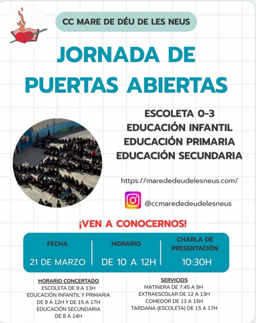 El próximo 21 de Marzo de 10 a 12h se llevará a cabo la jornada de puertas abiertas para el CC Mare de Déu de les Neus para: