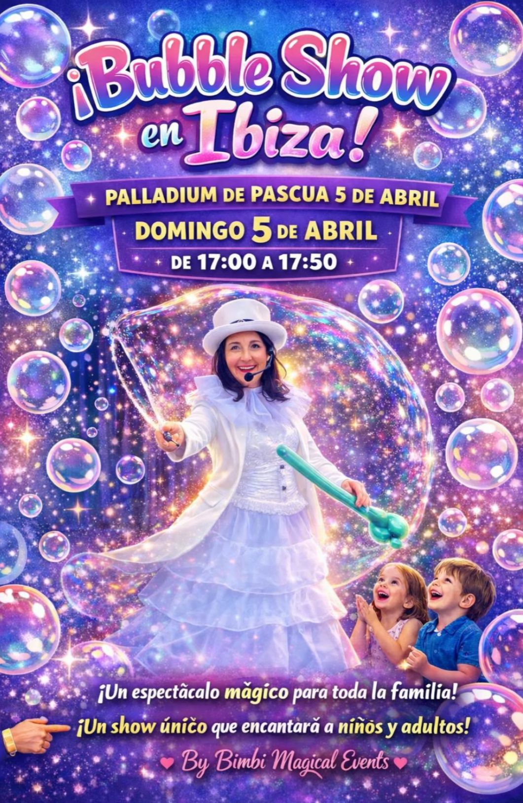 El Domingo 5 de Abril de 2026 de 17:00 a 17:50 en Palladium Show de burbujas con Bimbi Magical Events