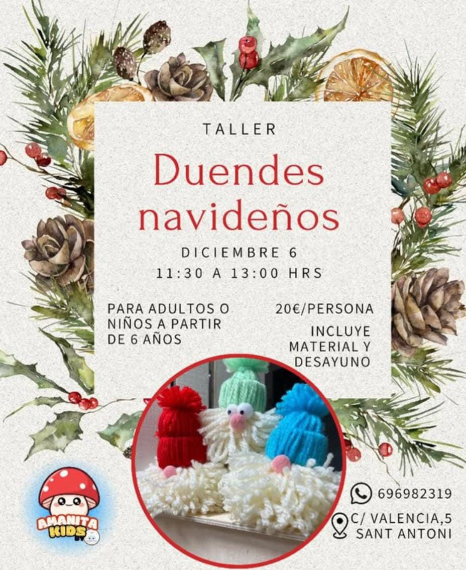El Sábado 6 de Diciembre de 2025 de 11:30 a 13:00 en Amanita Kids, Sant Antoni Taller Duendes navideños Para