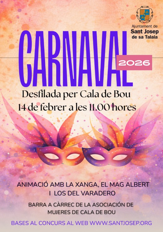 El sábado 14 de Febrero de 2026 desfile de Carnaval por Cala de Bou, que este año será por donde desfile la rua del Ayuntamiento de Sant Josep a las 11h