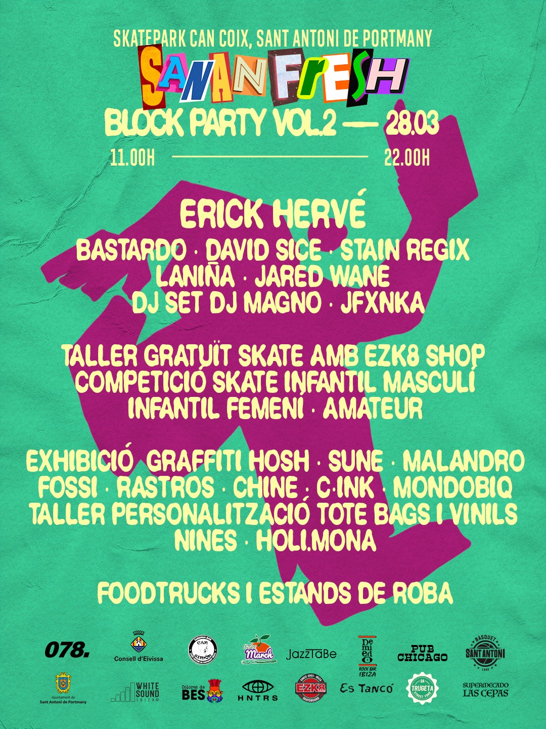 El próximo Sábado 28 de Marzo de 11 a 22h se llevará a Cabo en San Antonio, en el Skatepark de Can Coix el SananFresh, Block Party Vol.2