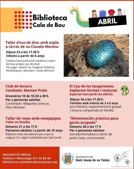 Inscripción previa al wasap 971348630 o biblioteca.caladebou@santjosep.org