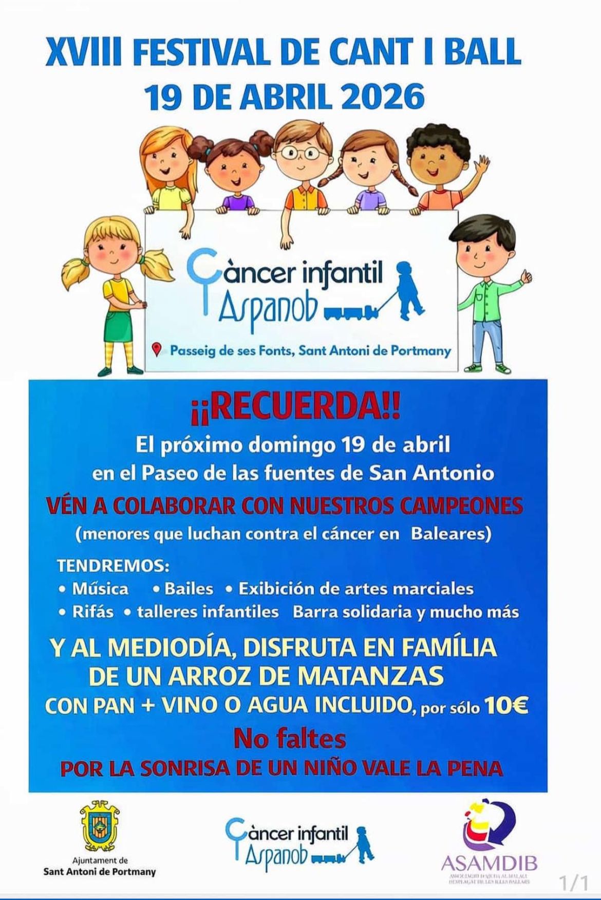 El próximo Domingo 19 de Abril se celebra el XVIII Festival de Canto y Baile a beneficio de la Asociación Aspanob en el Paseo de las Fuentes de Sant Antoni de Portmany.