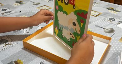En casa lo hemos hecho entre todos (abuelos y amiguitos incluidos) y al terminarlo lo hemos colgado en la habitación como decoración