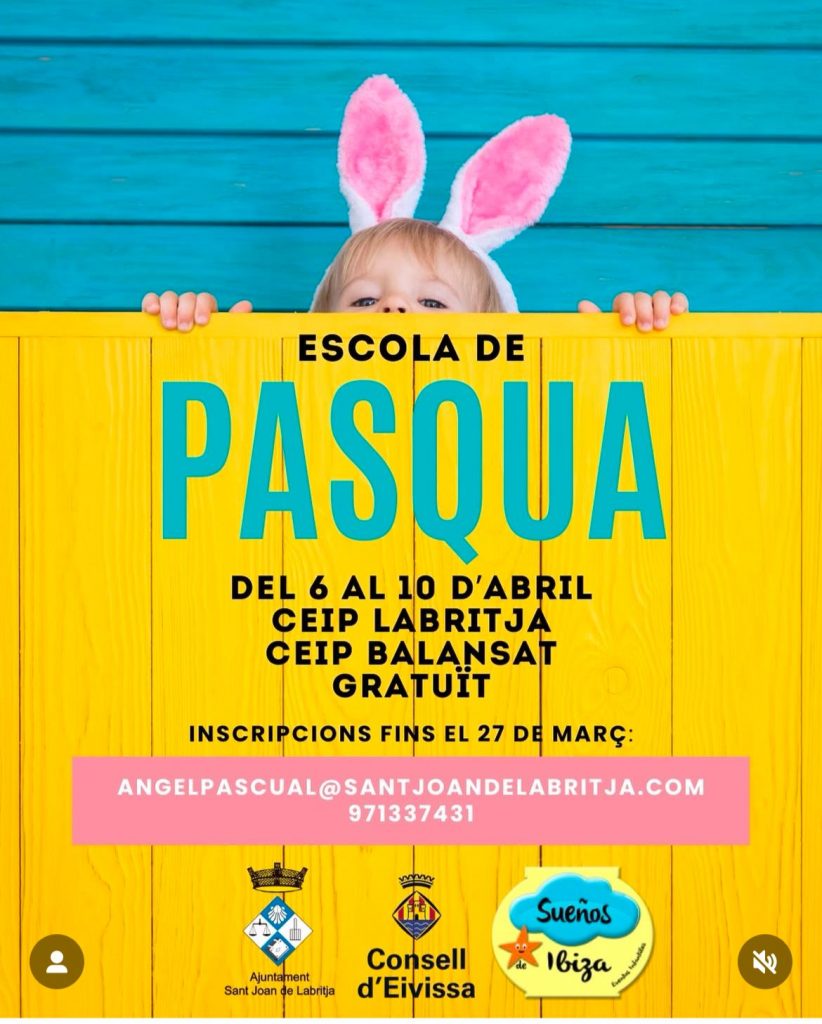 Escuelas en Pascua Escuelas en Vacaciones Escuela de Pascua, Sant Joan 2026 15 de marzo de 202615 de marzo de 2026 Ibiza Fun Family 0 comentarios Escuela de Pascua, Sant Joan de Labritja 2026 Otro año más el Ayuntamiento de San Juan ha puesto en marcha su escuela de pascua para niños y niñas desde el 6 al 10 de Abril. Tendrán lugar en:– CEIP Labritja– CEIP BalansatServicio gratuitoInscripciones hasta el 27 de Marzo. Contacto e inscripciones a angelpascual@santjoandelabritja.com971 33 74 31En colaboración con el Consell d’ Eivissa y Sueños de Ibiza