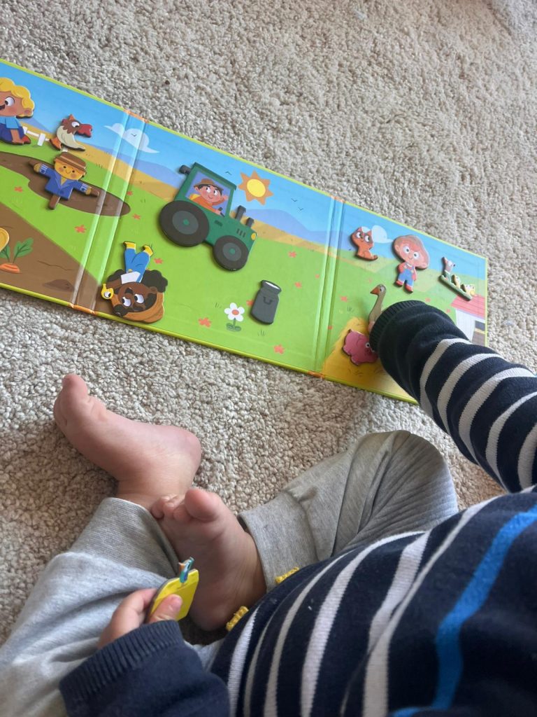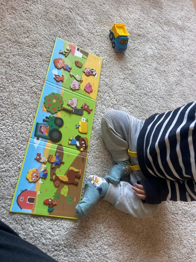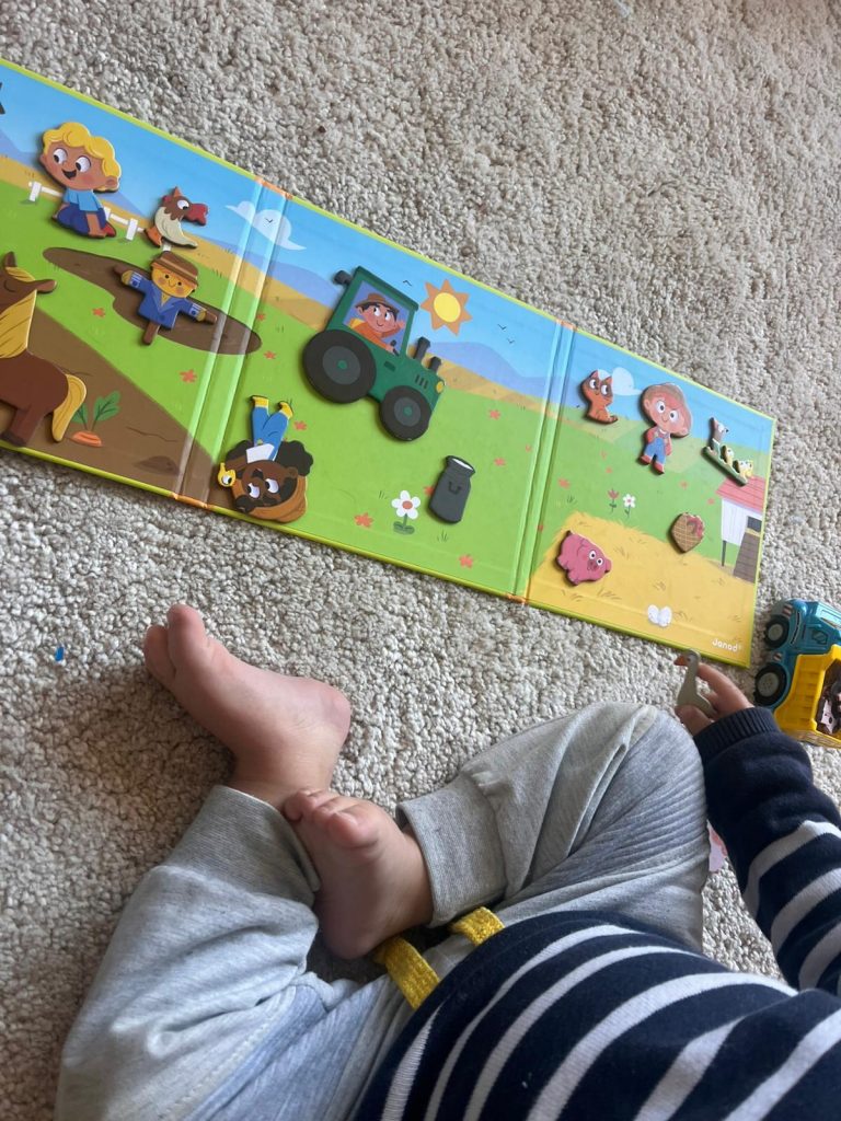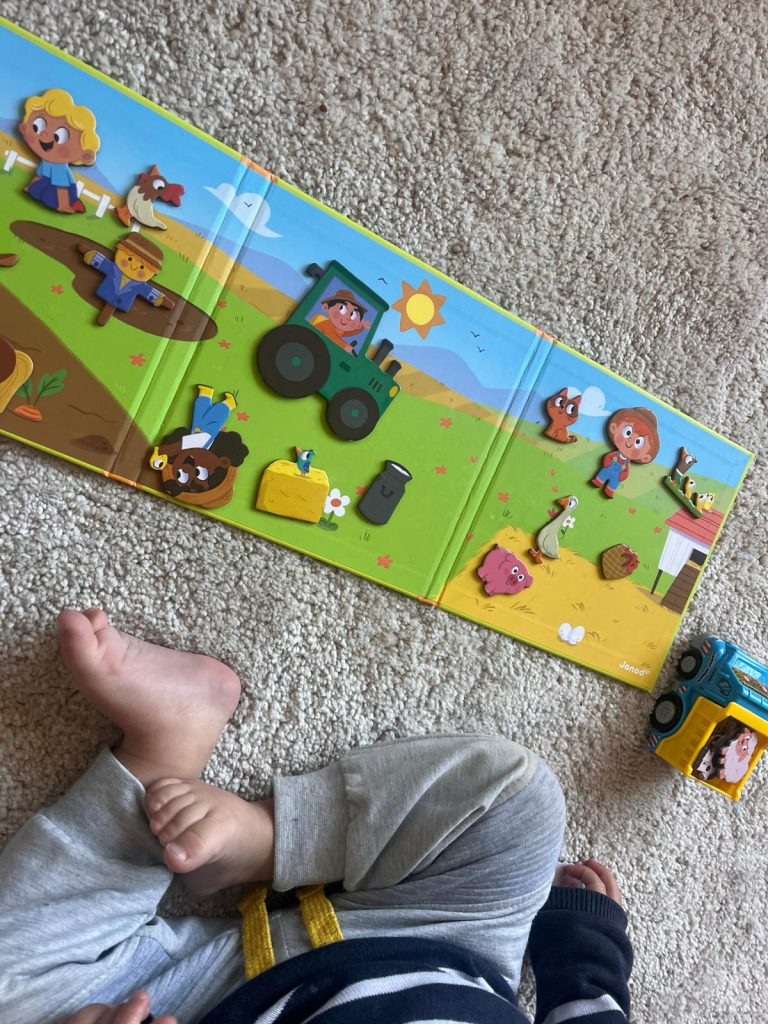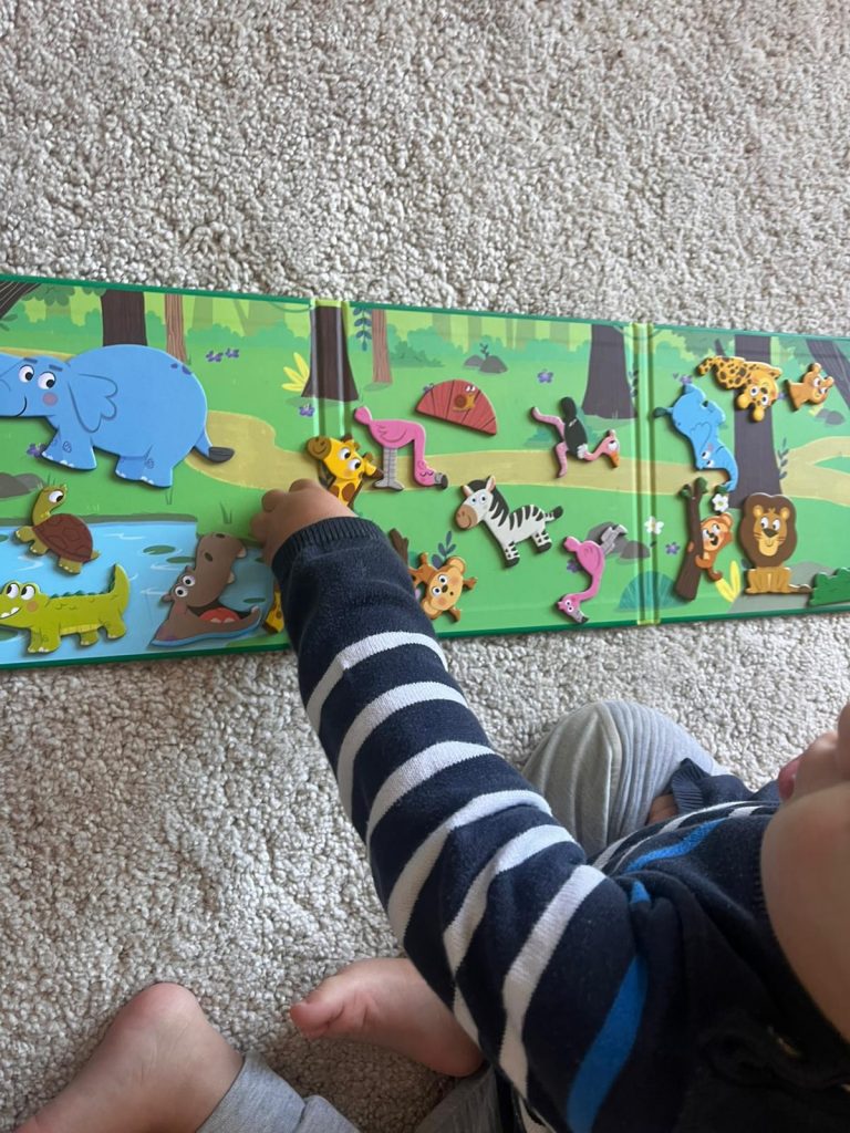 Uno de nuestros juegos favoritos es pedirle qué objeto y/o animal nos tiene que dar, que él lo reconozca, nos lo ofrezca y podemos hablar de su sonido u otras características.
