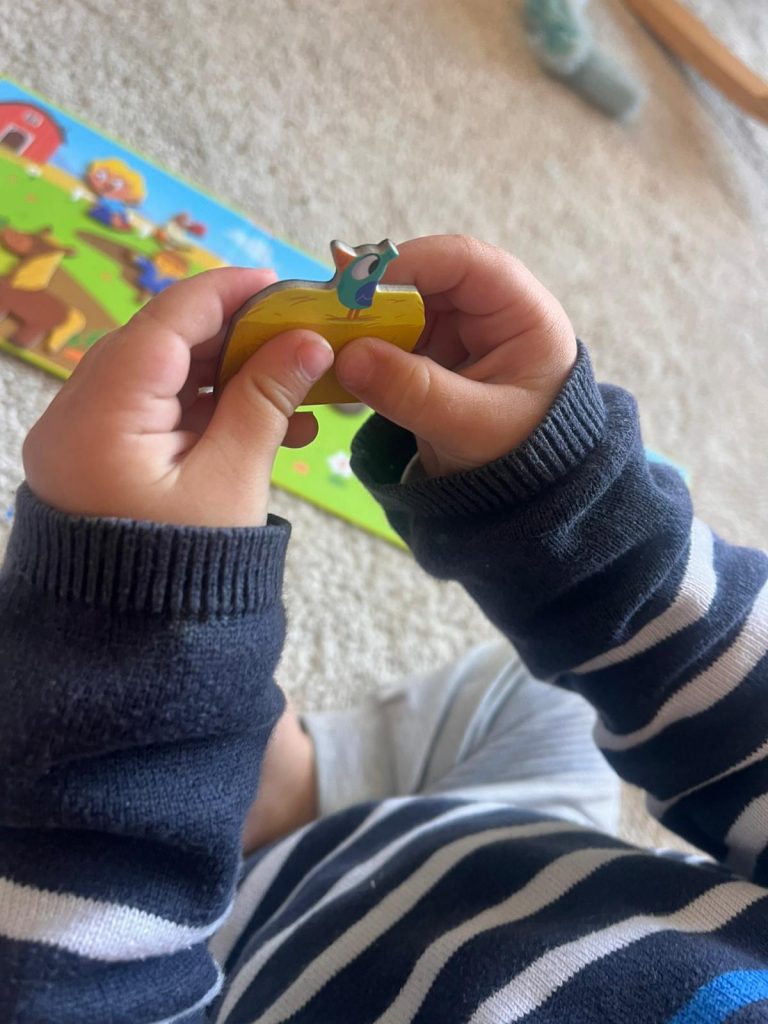 El peque identifica, elige y entrega la pieza, trabajando comprensión verbal, atención y lenguaje de forma natural y sin forzar.