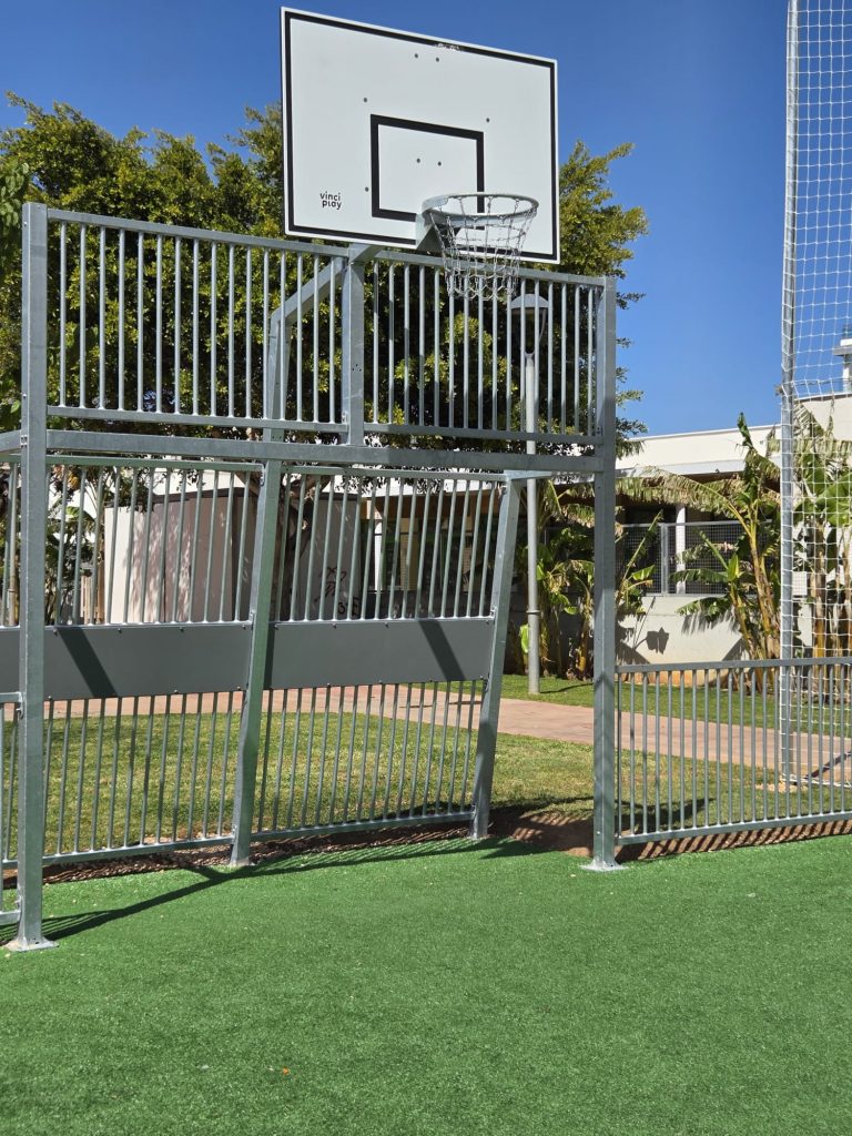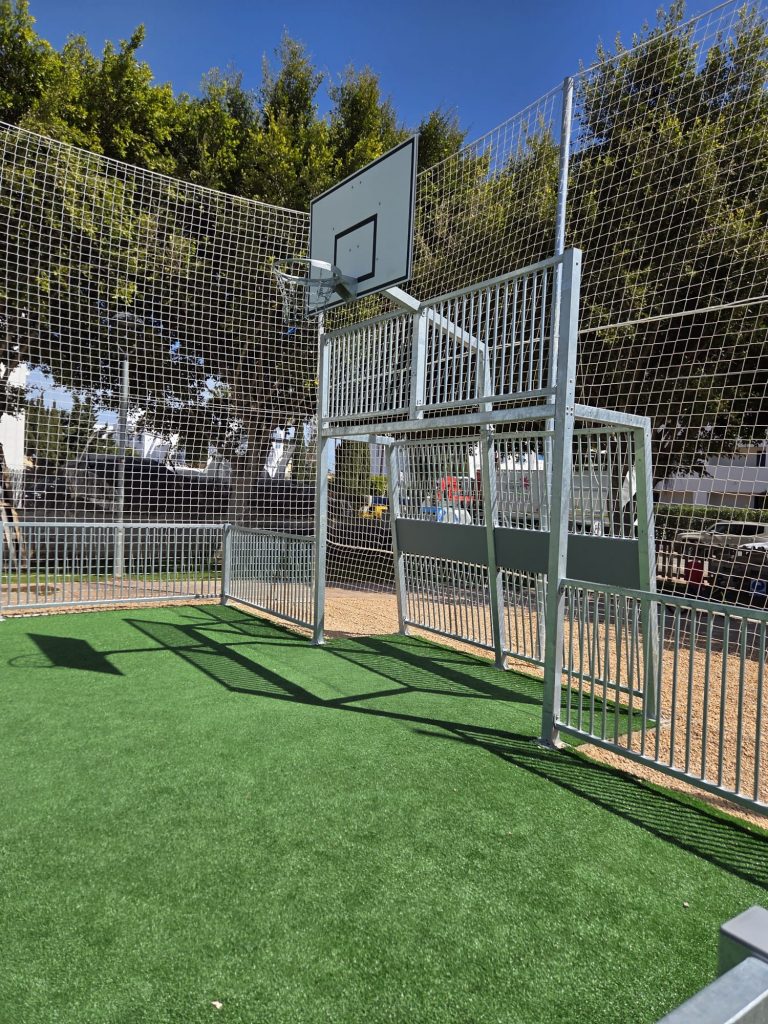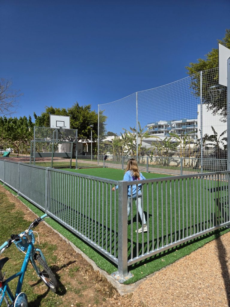 La última novedad es la incorporación de un campito de fútbol de pequeño tamaño, completamente vallado, que cuenta con dos porterías y dos canastas. Todo el espacio está acondicionado con césped, creando una zona segura y versátil donde los niños pueden jugar tanto al fútbol como al baloncesto.