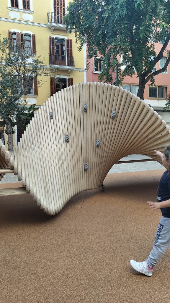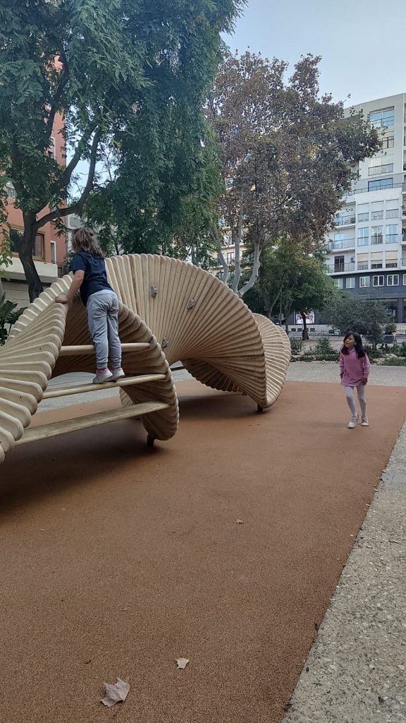 En pleno paseo de Vara de Rey ya se puede disfrutar de esta nueva estructura de madera pensada para dejar volar la imaginación. No es un juego tradicional, sino una escultura jugable donde cada niño inventa su propia aventura: subir, deslizarse, trepar, esconderse o correr entre sus curvas.