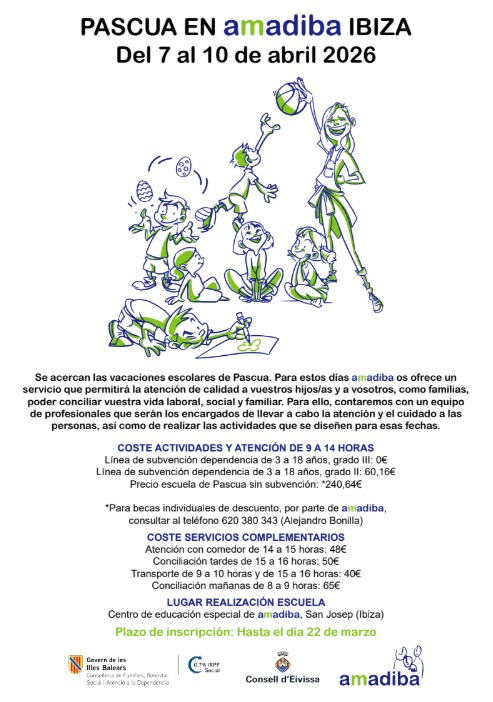 Escuelas en Pascua Escuelas en Vacaciones Pascua 2026, Amadiba Ibiza 16 de marzo de 202616 de marzo de 2026 Ibiza Fun Family 0 comentarios Pascua 2026, Amadiba Ibiza Amadiba abre este año 2026 su escuela en Pascua con una atención de calidad ayudando a la conciliación familiar con personal cualificado. Dirigido a niños y niñas de 3 a 18 años en horario de 9 a 14h con posibilidad de Matinera desde las 8h y Tardana hasta las 16h. Se llevará a cabo en el Centro de Educación Especial de amadiba ubicado en Sant Josep (Ibiza) Plazo de inscripciones hasta el 22 de Marzo. Consulta los costes de la actividad según su grado de dependencia y becas individuales. Más información y reservas en su web Ir a inscripciones